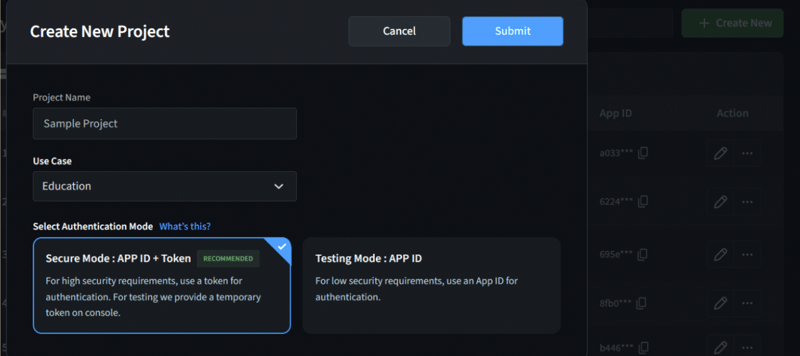 - Agora アカウント: この機能のご利用には、Agora へのサインアップが必要となります。